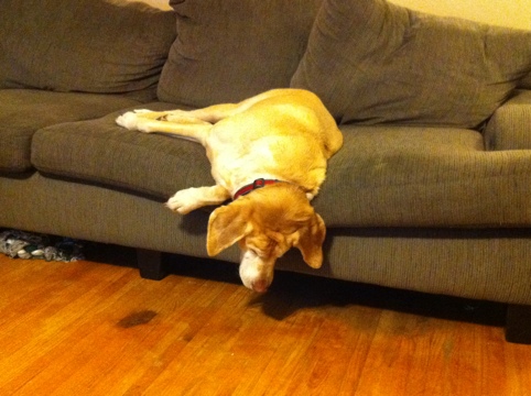 So my dog over did it playing in the snow today. He passed out super hard on the couch. Here’s a few pics if my 120lb lab while my 30lb+ cat wakes him a bit…